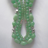 Miriam mixed varying shapes of Green Aventurine and Sterling Silver to create a three-strand necklace that is sure to welcome compliments. The glistening effect of the mica inclusions and granular color effects are beautifully evident in this luxurious necklace.Varying shaped Sterling Silver accents reflect the lovely green of Aventurine.