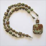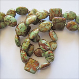- The necklace is 21 inches long and includes both square and oval Green Opals and toasty brown fine glass and sterling silver beading.