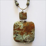 The natural colorations of this square-cut Green Opaque Opal Pendant and Necklace stones illustrate a wonder of Mother Nature—how stones of the same family always exhibit totally different mosaics. No two natural stones are exactly alike, even when they are of the same cut and have the same or similar colorations. The Pendant is accented by Miriam's Signature Sterling Silver Swirl.