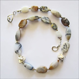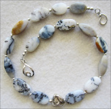 About Dendritic Agate: Dendritic agate is an interesting stone that is distinguished by its beautiful and distinct tree or fern like markings known as dendrites—which are brown to black traces of iron or manganese. Considered as one of the rare varieties of agate, Dendritic Agate is technically classified as chalcedony quartz, and not a true agate. That is because it lacks the typical banding seen in most agate stones, but has a translucent to opaque quality, and is usually colorless to whitish-gray or blue-gray. Some stones may include shades of brown, golden brown, and reddish brown due to traces of iron. The iron and manganese crystallize inside the agate in unique branching formations by seeping through fine surface fractures. Some of those fractures appear in many of the stones, which add to their natural beauty. A few stones Miriam used in this series of necklaces are deeper reddish brown due to the iron, but still show the distinct dendritic markings and areas of translucency—which is why they are called “agates.” Agates available on the market today, originate from deposits all over the world including Myanmar, Brazil, Uruguay, Argentina, Mexico, Botswana, India, Australia, and the USA.