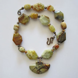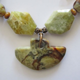 Inspired by the beautiful and distinct rustic look of itsearthy neutral shades of brown, subtle green and yellow greens - Miriam created this interesting and mysterious Flower Jade necklace to be the center of attention. Striking when worn on virtually any color and for any occasion. All the necklace stones are reversible, with both sides of the pendant shown in the photos. Flower Jade is found in Japan, Myanmar, Guatemala, and North America.