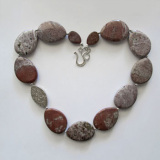 For this exceptional necklace, Miriam chose from seven strands of natural Kabamby stones to select only the mauve/lavender/burgundy/deep red beauties. Like most of Miriam's necklaces, each stone is reversible. Kabamby Ocean Jasper is known for its lush grainy appearance and its opaque colors and patterns - dark greens and mustardy yellows, and accents of pink and mauve, red and white. The Israeli Silver Marquise Focal bead is beautifully carved on the front, back and sides.