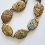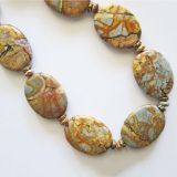 There’s a reason the planet Venus is also called the “Morning Star” planet. The gorgeous soft golden yellows, rose, and blue-grey tones of Venus look like the swirling clouds when it appears in the east—just before sunrise. The large oval Venus Jasper stones Miriam selected for this exquisite necklace show all these lovely and naturally occurring shades. Matching bracelet and earrings are available by custom order.