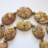 Venus Jasper is mined in Mexico. The beautifully designed and carved brass beads are handcrafted by Anna Bronze—Like her bronze beads, Anna’s brass beads are solid brass, not brass-coated metal. The textured bronze clasp is Old World Bronze(TM)—Handwrought using ancient methods of casting bronze that have been modernized by the Charveaux family of metalsmiths in Scottsdale, Arizona. Utilizing their carefully developed bronze formula, and an age-old “lost wax” method, each bronze bead and clasps are artistically designed and handcrafted.