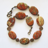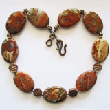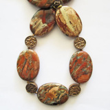 Australian Picture Jasper naturally features interesting ribbons and splashes of terracotta, red, teal, peach, black, and shades of brown. The gorgeous stones in this necklace were selected by Miriam because of the predominance of their lush natural red color--they reminded her of a blazing sunset. Miriam chose beautifully textured bronze disks from Old World Bronze(TM), which were handwrought by the Charveaux family of metalsmiths in Scottsdale, Arizona. Utilizing their carefully developed bronze formula, and age-old wax casting method, each bronze bead is artistically designed and handcrafted. The “peppercorn” intricately carved round beads were designed and handcrafted by Anna Chernykh of ANNA Bronze. Anna lives and works in Kungur, a small town in the Ural Mountain area of Russia. She also uses an old wax casting method. The shiny round disk accents are solid brass from India--not brass-coated metal.