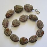 The amazing intricate patterns of the stones in Miriam’s Private Mushroom Rhyolite Collection are gorgeous! Mushroom Rhyolite gets its name from its small fungal-like shapes in gray, taupe, and brown. The stones also show the typical rhyolitic pattern of red halos, and others are also brecciated (solidified) with quartz against a green background—another beautiful feature of the stones Miriam chose. Stones that look grayish-brown indoors, photograph in the bright sunlight showing their natural green hues. With her focus always on the natural stone colorations and patterns, Miriam used a minimum of Sterling Silver accents--small corrugated Sterling Silver beads in a twist pattern that complement the swirling mushroom patterns of the stones.