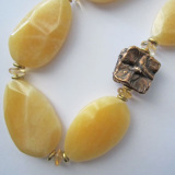 Miriam created a sophisticated, modern design using natural Yellow Calcite, Citrine, Bronze and Brass. Softly faceted, each stone is smooth to the touch and shows the lustrous, pearly opaque and translucent features of Calcite. This work of Wearable Art is sure to get plenty of compliments. The handwrought Old World Bronze(TM)“Flower” bead chosen by Miriam as the focal point is intricate and generously sculpted—with a beautiful patina that glows in the sunlight.