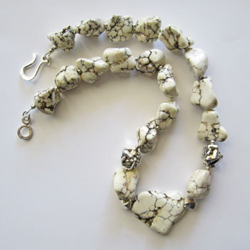 Miriam could not resist this unusual free-form Magnesite heart. She used it as the focal stone for this distinctive Chunky necklace. Each nugget is separated by a round Sterling Silver bead. The two large sculpted nuggets and two small sculpted accent beads are Electroformed* Sterling Silver.The necklace may look heavy, but is lightweight and comfortably drapes around the neck.