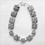 Miriam combined a stunning array of square Black and Gray Picasso with stunning Sterling Silver Starburst beads to create this distinctive necklace. The handmade sterling silver beads with a starburst design create a unique touch to this elegant statement piece. Smaller Gray Zebra and Sterling Silver beads accent the larger stones. The clasp is hammered sterling silver. Picasso Jaspers are opaque stones with natural dark, jagged stripes of black or brown on backgrounds of white, gray, or tan. Some of the stones Miriam chose have a subtle splash of sandy beige twisting through the grey background, which provides a rich texture to the beads. Miriam particularly likes the Picasso Jasper’s random and lightening-like patterns.