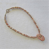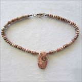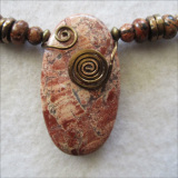 This pendant-necklace combination is a beautiful example of Mexican Crazy Lace Agate. The Pendant stone selected by Miriam shows all the amazing natural features of this interesting stone, including a combination of chevron angles and lacy swirls in red, peach and pink, beige and creamy white, with some areas showing a soft spray of translucency.Miriam used Vintage Bronze wire to wrap the pendant with her signature swirl. The necklace is composed of matching Mexican Crazy Lace rondelles. These stunning natural stones are accented by handwrought bronze spacers from Old World BronzeTM—which is handcrafted using an old-world wax method, and an exclusive bronze recipe developed by the Charveaux family of metalsmiths in Scottsdale, Arizona.