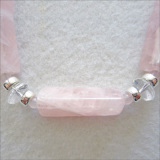 Each Rose Quartz stone Miriam used for this lovely, delicate necklace ranges from clear to translucent – and genuinely sparkles in the sunlight. The pyramid shape of the stones, and the Crystal Clear Quartz and Sterling Silver accents, add to this sparkling quality.